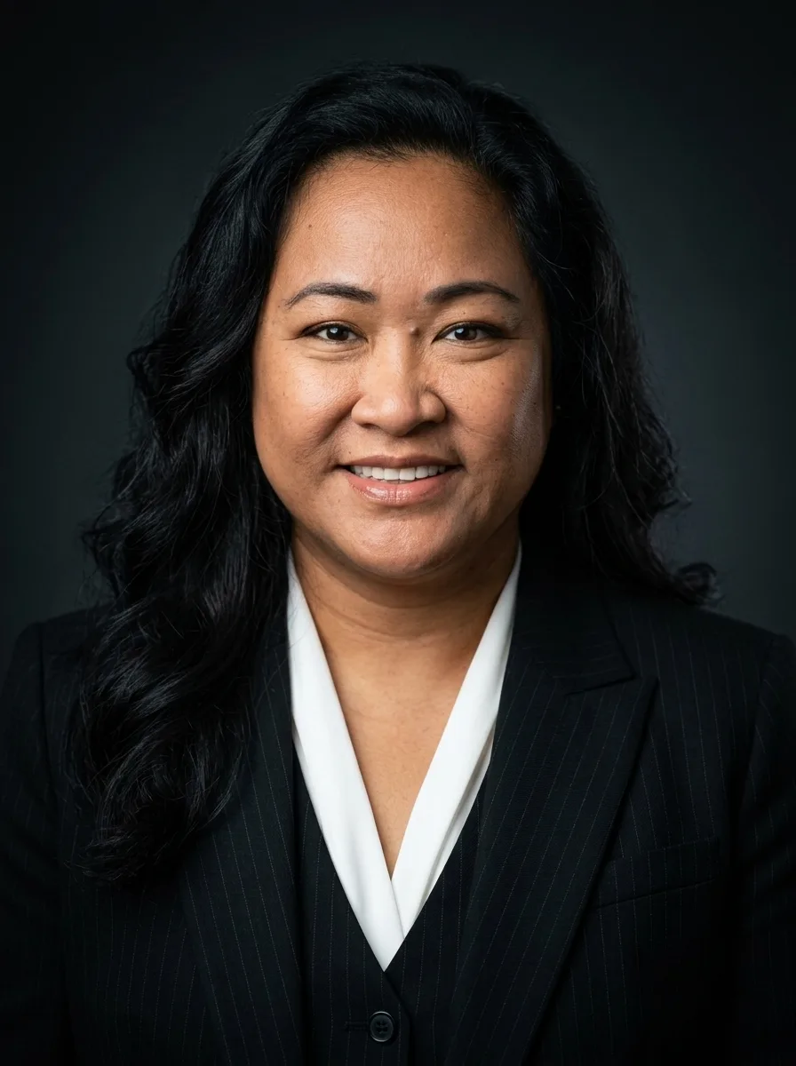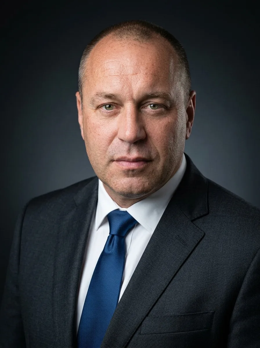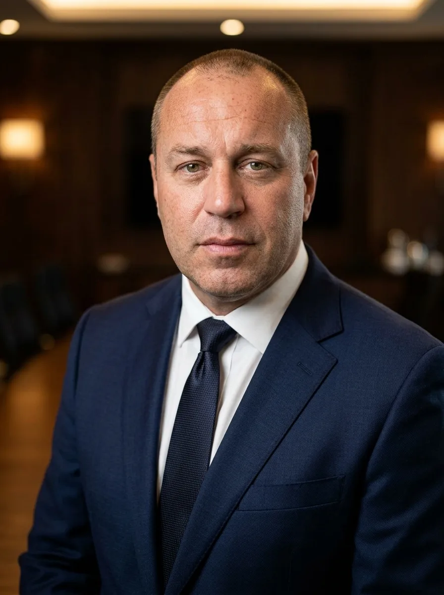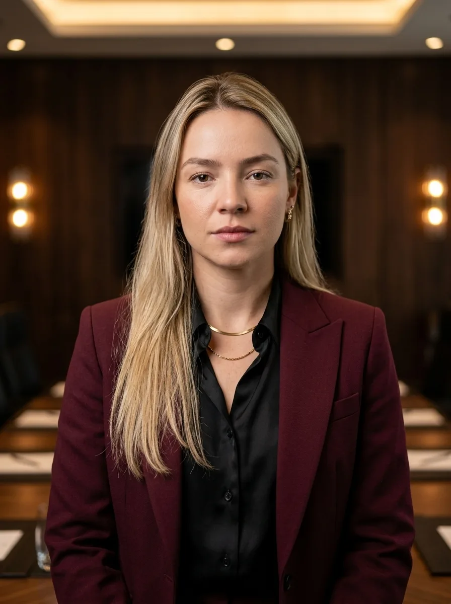 For male executives: a well-tailored charcoal, navy, or black suit. A subtle pocket square adds polish. For female executives: a structured blazer in dark neutral tones, or a tailored pantsuit. Avoid anything flashy. Your expression and posture carry the weight here — the clothing should not compete with them.